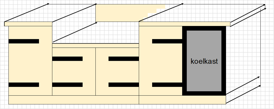 Wijkt af van de vorige keuken en heeft geen 3 maar 2 delen. Dus ongeveer 1 meter breed.
