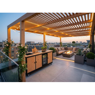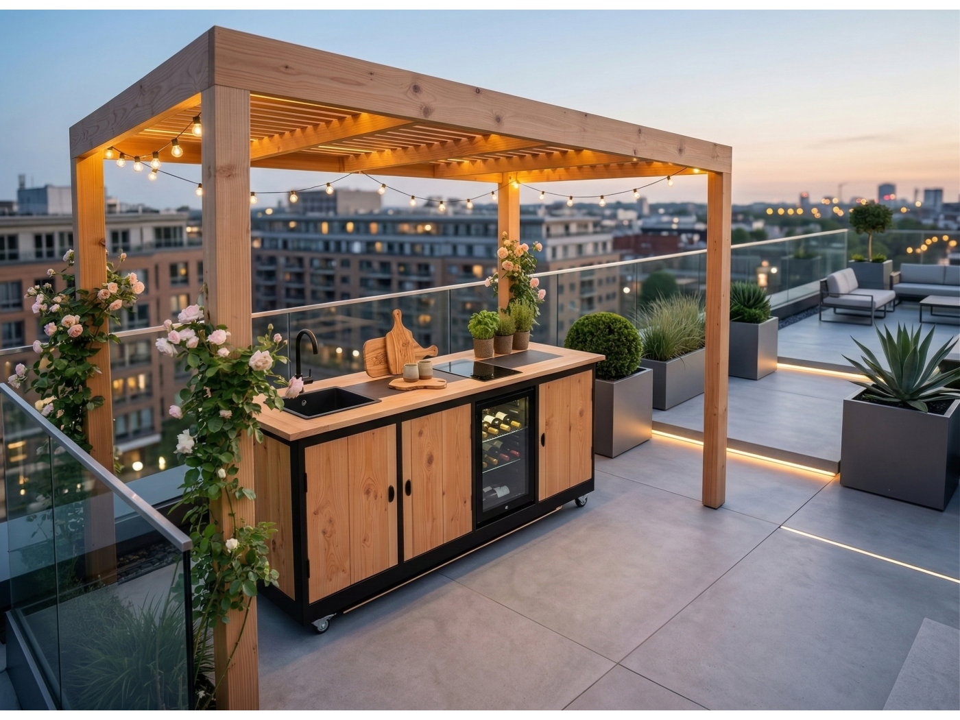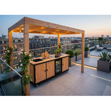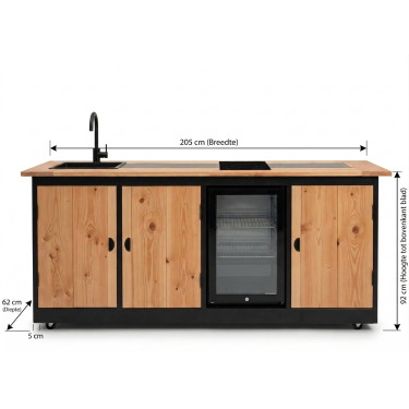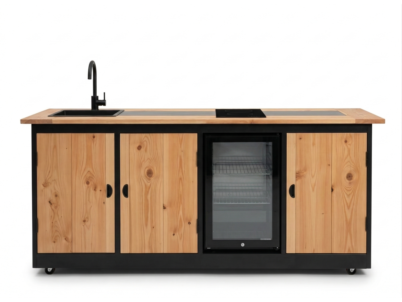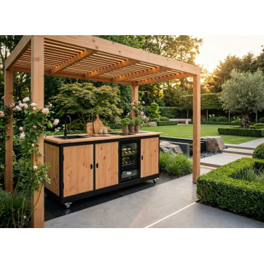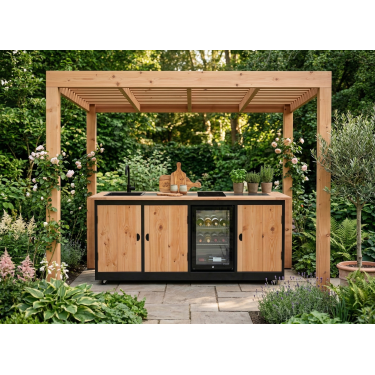 Ontmoet de Buitenkeuken Caella: een meesterwerk van functionaliteit en design voor de veeleisende buitenkok. Met een lengte van 205 cm en een complete uitrusting van water tot elektra, is de Caella meer dan een keuken; het is een volledig outdoor kookstation. Vervaardigd uit duurzaam Douglas hout, brengt dit model de gezelligheid van binnen direct naar je terras of overkapping.