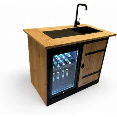 Het werkblad, afgewerkt met elegante zwart ingelegde keramische tegels (30 x 60 cm), biedt een stevige en stijlvolle basis voor al je kookavonturen. Je bent van alle gemakken voorzien met een Lomazoo kraan en wasbak en een Koald koelkast van 70 liter (0-10 graden) – perfect om je ingrediënten en drankjes koel te houden.