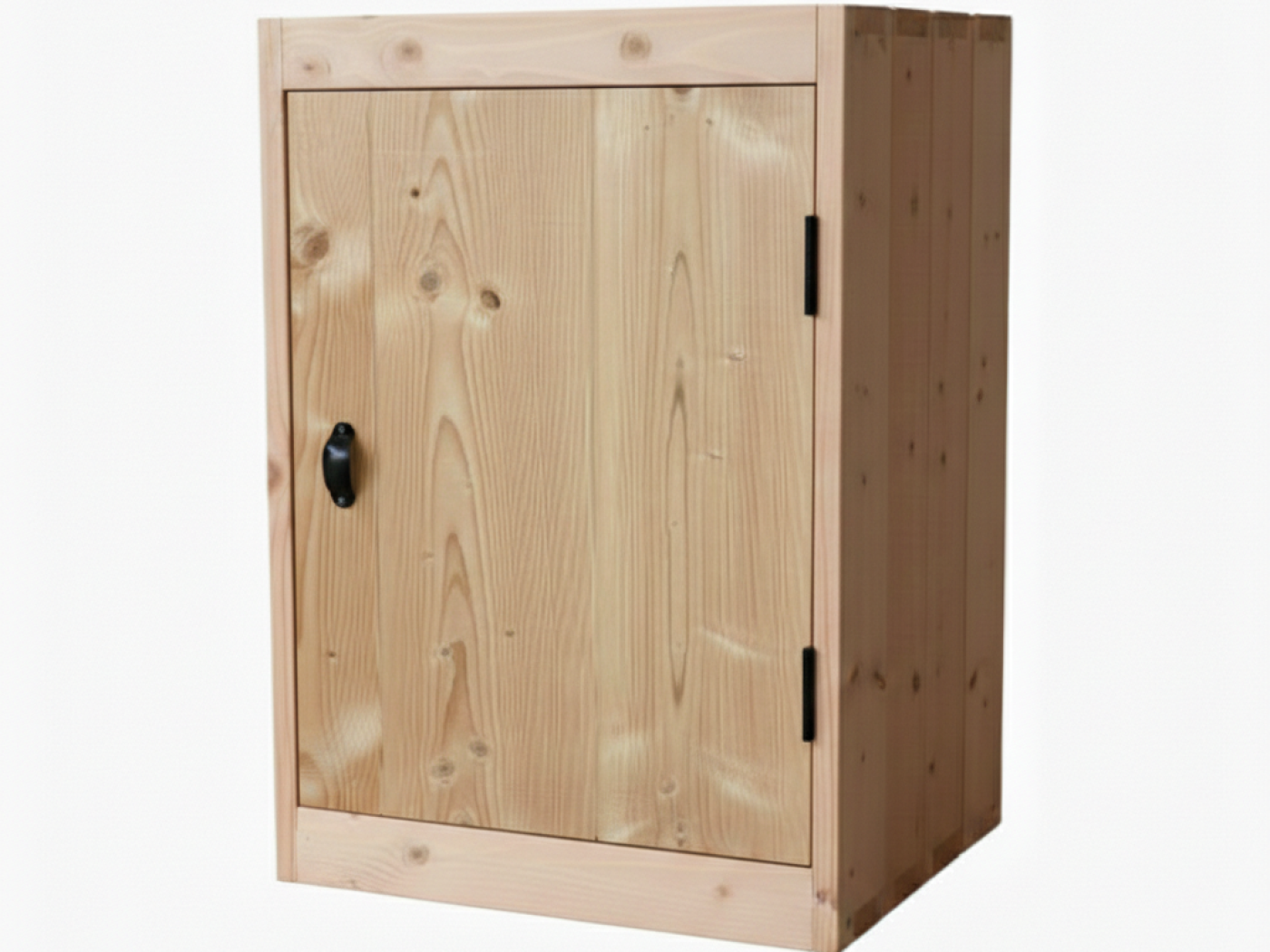 Kies voor eenvoud met een deur met een normaal gemonteerd scharnier. Deze deur draait open van links naar rechts en heeft de scharnieren daarom aan de rechterzijde. In het kastje wordt altijd een schap gemonteerd in het midden van het paneel.