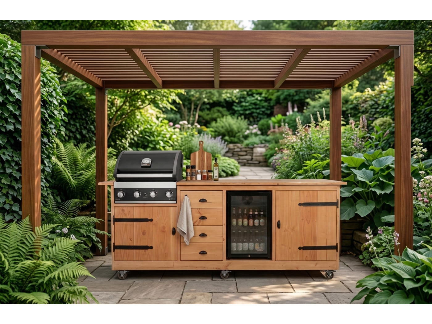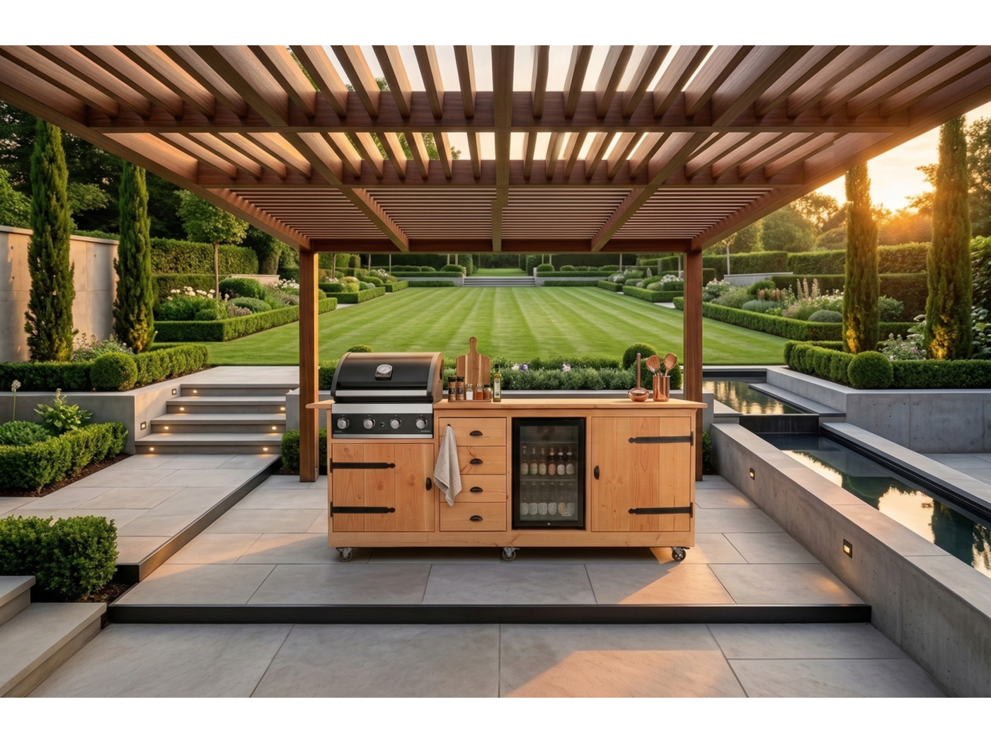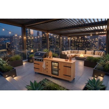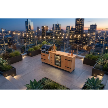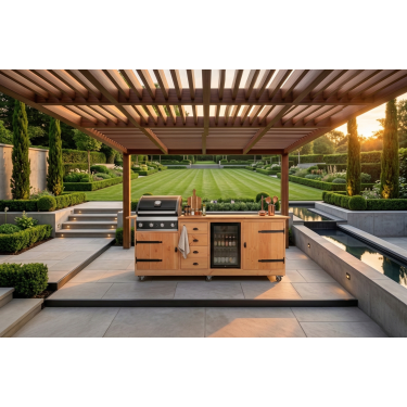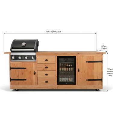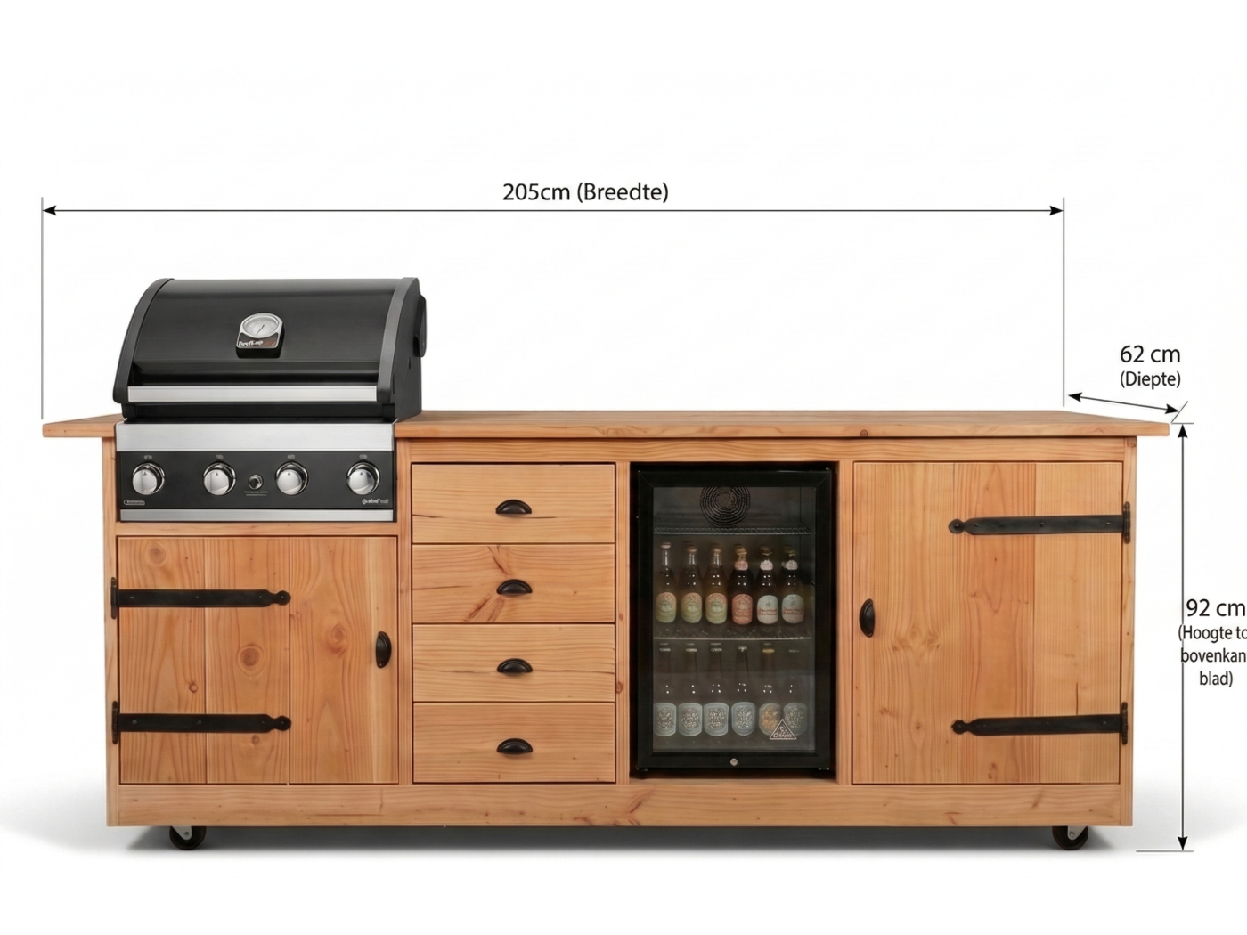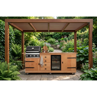Met de Buitenkeuken Alicante haal je een complete culinaire werkplaats naar je tuin. Met een breedte van 223 cm biedt deze keuken alles wat een veeleisende grillmaster nodig heeft: van een krachtige inbouwgrill tot slimme opbergruimte en directe koeling. Het warme douglashout geeft de Alicante een tijdloze, robuuste uitstraling die in elke tuin tot zijn recht komt.