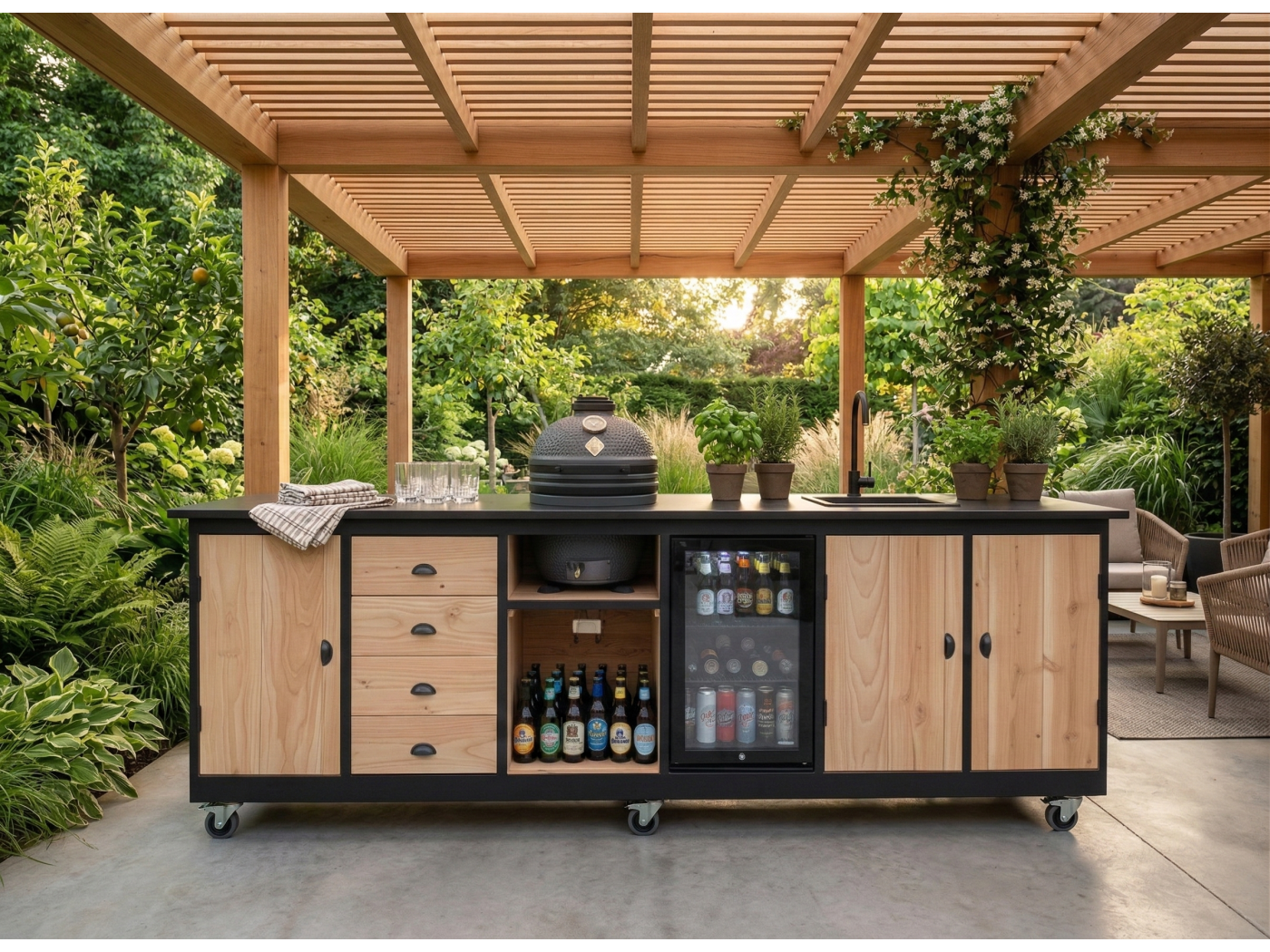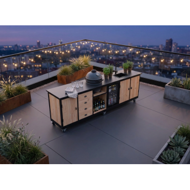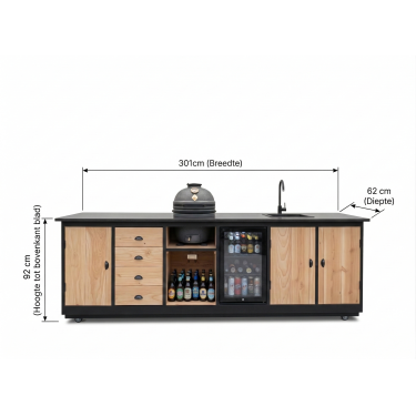 De Brasilia is het vlaggenschip onder de buitenkeukens. Met een lengte van ruim 3 meter, een hoogwaardig gesinterd stenen blad en de combinatie van een Kamado én een watervoorziening, is dit de ultieme buitenkeuken voor de serieuze grillmaster.