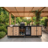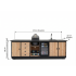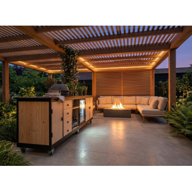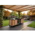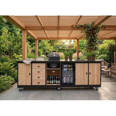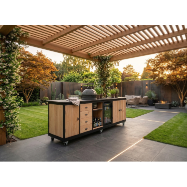 De Buitenkeuken Brasilia is met zijn 301 cm een indrukwekkende verschijning in elke tuin. Deze keuken is ontworpen voor de veeleisende buitenkok die geen compromissen sluit op het gebied van functionaliteit en esthetiek. De Brasilia combineert de warmte van ambachtelijk douglashout met de onverwoestbare elegantie van een 12 mm gesinterd stenen blad.