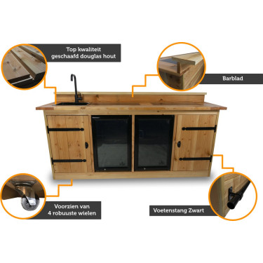 De Buitenkeuken Brisbane is de perfecte aanvulling op uw tuin of terras voor eindeloos kookplezier in de open lucht. Met zijn robuuste afmeting van 205 x 66 x 92 cm (inclusief wielen) biedt dit meesterwerk voldoende ruimte om een volledige maaltijd te bereiden en uw gasten een onvergetelijke ervaring te bieden.