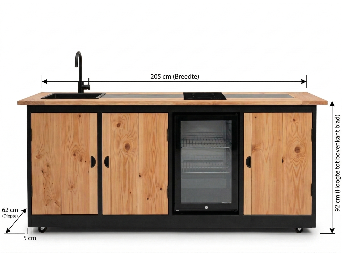 Ontmoet de Buitenkeuken Caella: een meesterwerk van functionaliteit en design voor de veeleisende buitenkok. Met een lengte van 205 cm en een complete uitrusting van water tot elektra, is de Caella meer dan een keuken; het is een volledig outdoor kookstation. Vervaardigd uit duurzaam Douglas hout, brengt dit model de gezelligheid van binnen direct naar je terras of overkapping.