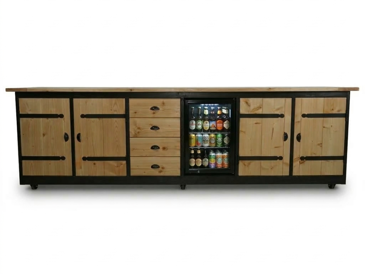 Geniet van ultieme functionaliteit met maar liefst zes panelen, waaronder een handige koelkast van 70 liter (0-10 graden) om uw ingrediënten vers te houden. De robuuste lades en kasten met klassieke zwarte kruishengen zorgen voor een praktische indeling, terwijl de wielen aan de onderzijde het mogelijk maken de keuken eenvoudig te verplaatsen.