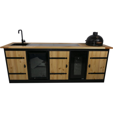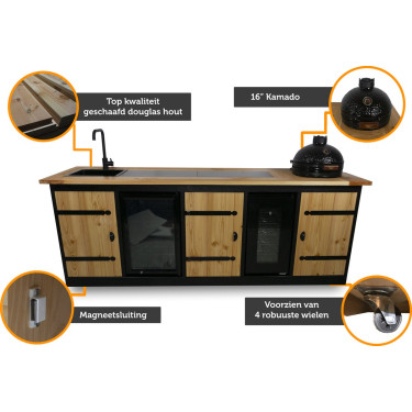 Volledige uitrusting: Inclusief een Lomazoo wasbak en kraan, een 70-liter koelkast (0-10 graden), een 52-liter wijnkoeling (8-18 graden) en een 16-inch kamado houtskoolbarbecue voor de ultieme culinaire ervaring.