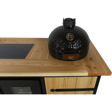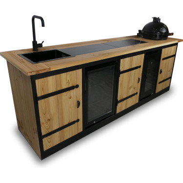 Met afmetingen van 253 x 66 x 92 cm biedt deze buitenkeuken ruime werk- en opbergmogelijkheden. Het robuuste douglas hout, aan beide zijden glad geschaafd en met een dikte van 3 cm, straalt pure kwaliteit uit. Het prachtige werkblad wordt verrijkt met keramische tegels van 30 x 60 cm, wat niet alleen een luxe uitstraling geeft maar ook praktische duurzaamheid biedt.