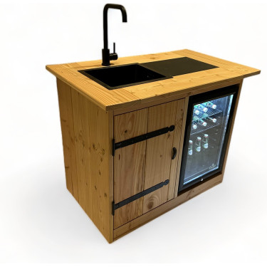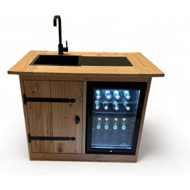 De ingebouwde kraan en wasbak maken opruimen kinderspel, terwijl de ruime koelkast van 70 liter uw drankjes en ingrediënten altijd op de ideale temperatuur houdt (0-10 graden). De indeling is slim ontworpen met een links draaiende deur, een handig schap in de kast voor opslag, en moderne zwarte kruishengen voor een stijlvolle afwerking.