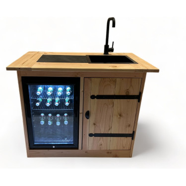 Het hoogwaardige douglas hout, glad geschaafd aan twee zijdes met een dikte van 3 cm, gecombineerd met ingelegde keramische tegels van 30 x 60 cm, zorgt voor een elegante en moderne uitstraling. Dankzij het ruime werkblad met een geïntegreerde kraan en wasbak heb je alle ruimte en comfort om de lekkerste gerechten te bereiden.