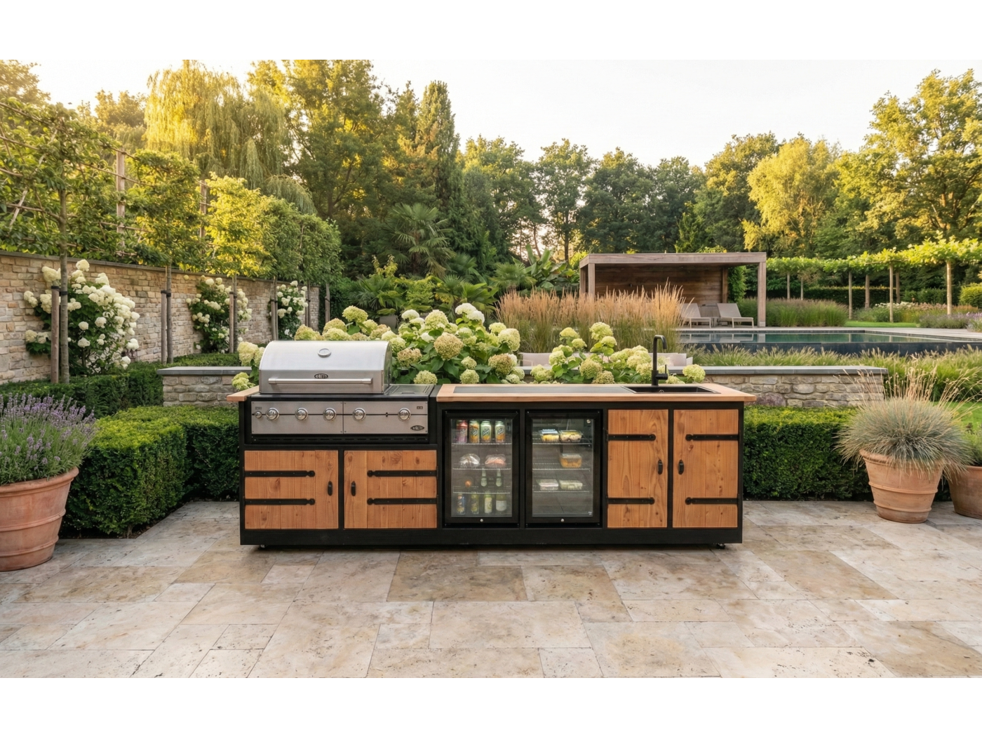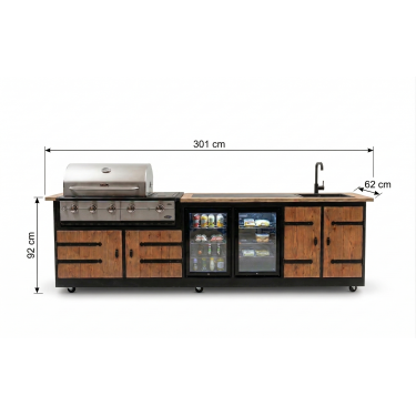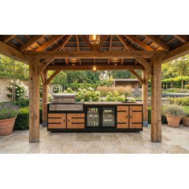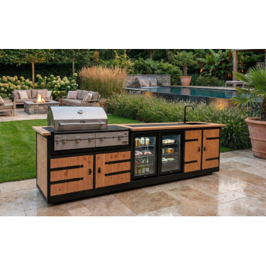 Met de Buitenkeuken Porto haal je de volledige culinaire ervaring van binnen naar buiten. Met een imposante lengte van 301 cm is dit niet zomaar een meubel, maar een compleet buitenstation waar vakmanschap, koeling en professioneel grillen samenkomen. Vervaardigd uit hoogwaardig douglashout, is de Porto de droom van iedere buitenkok.